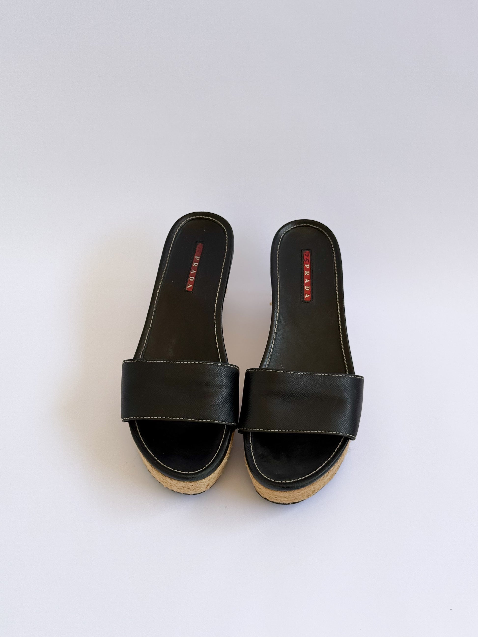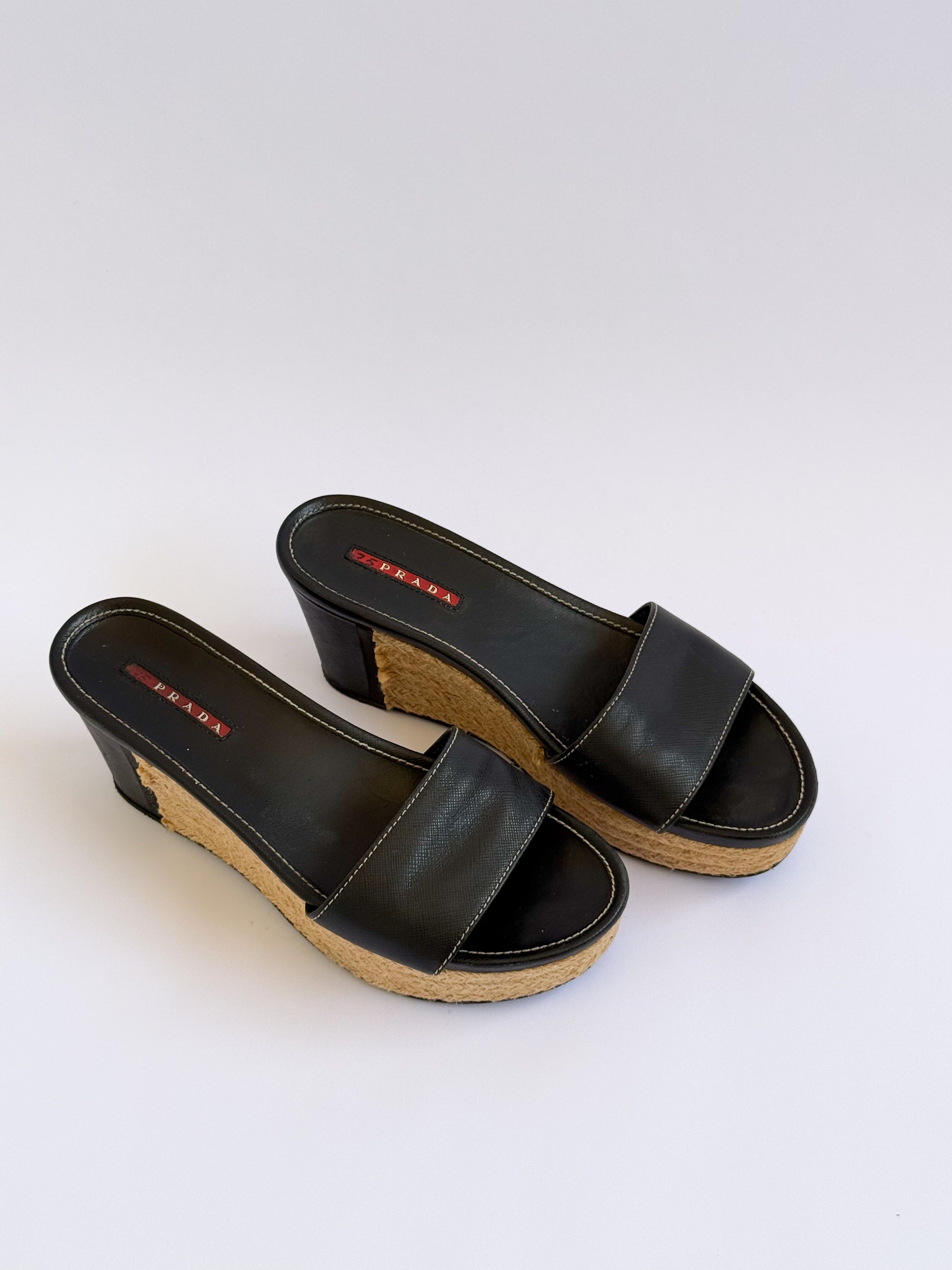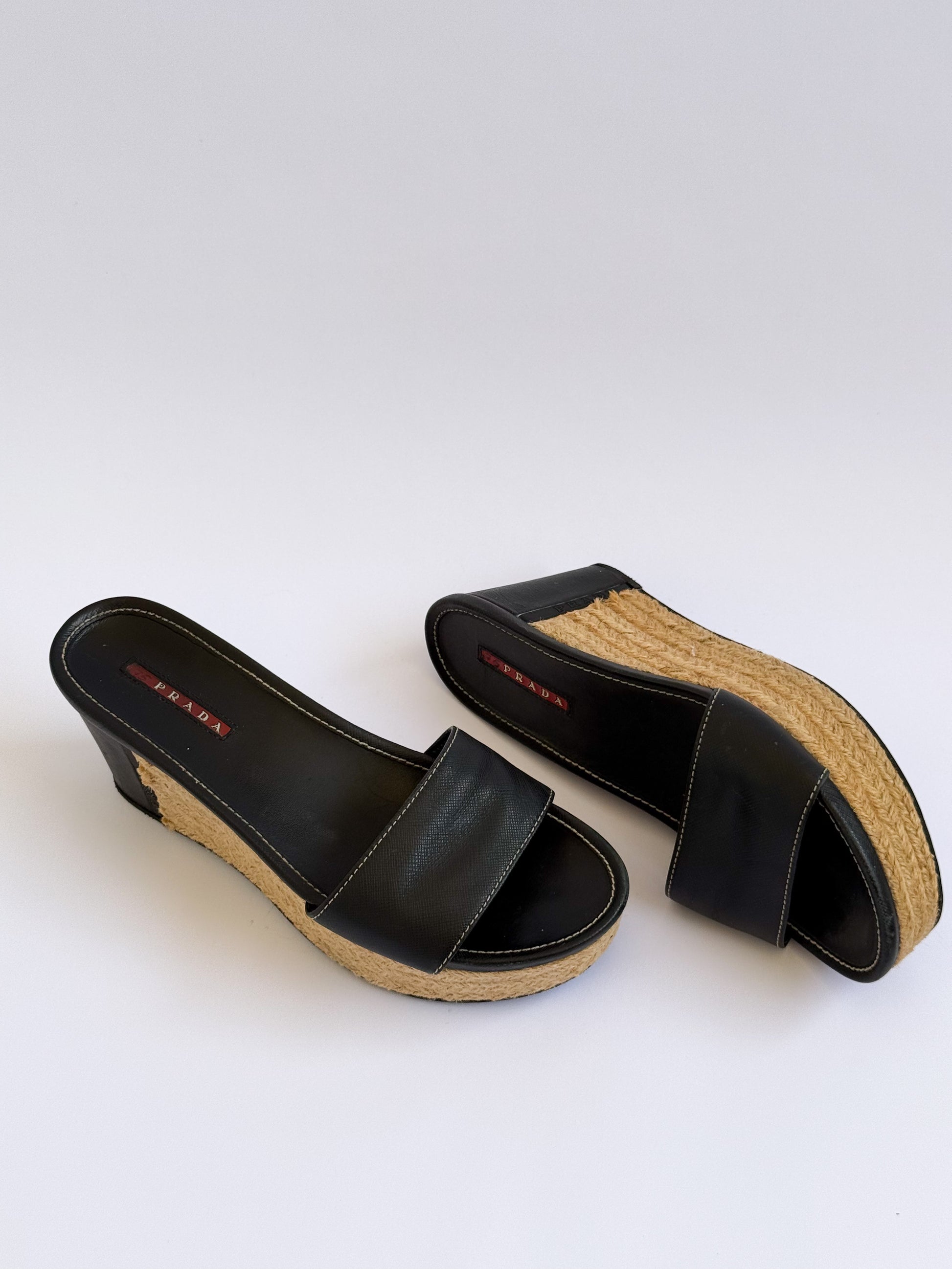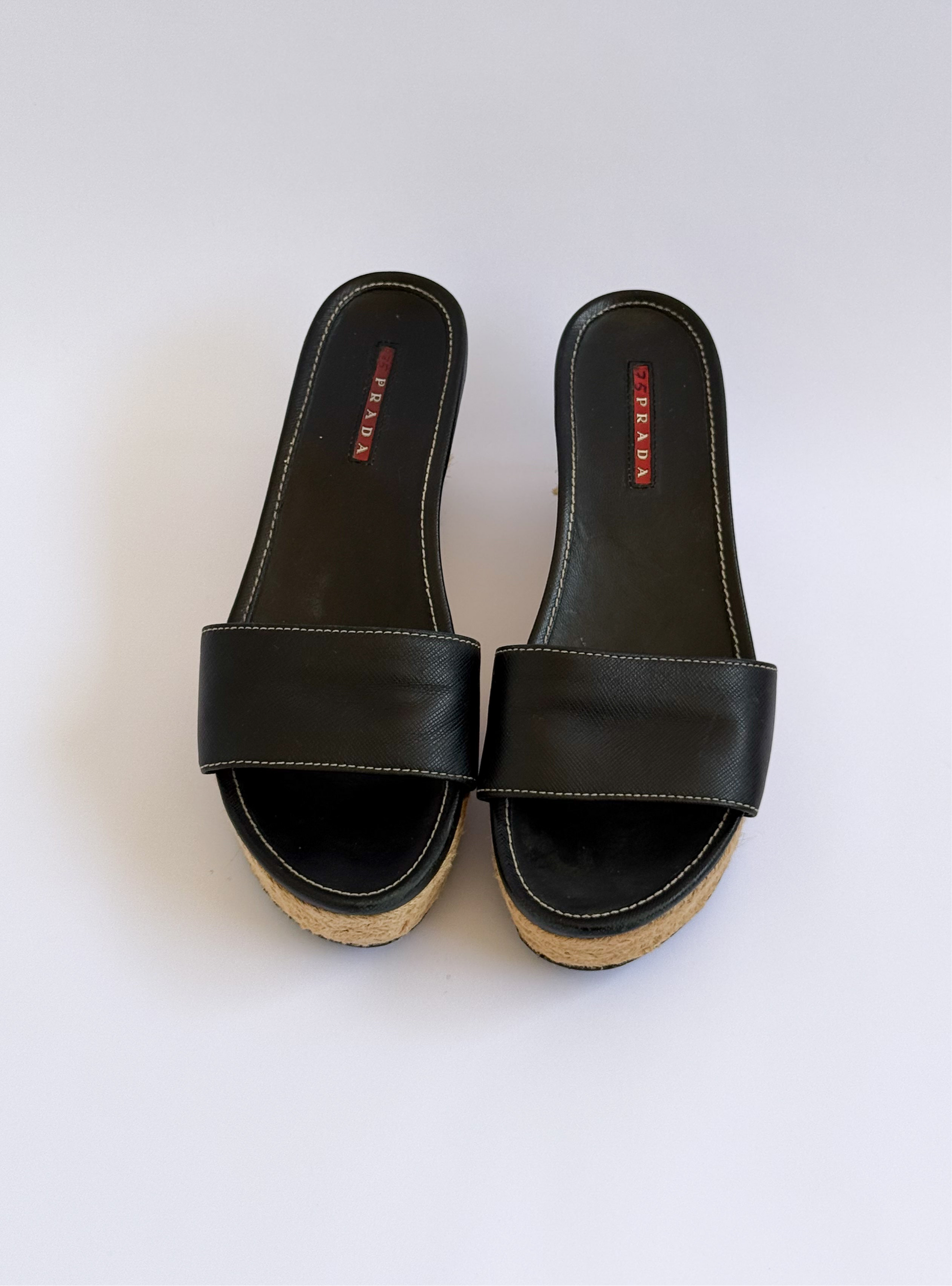 Prada vintage black leather espadrille platform slides, wide strap design, early 2000s style.